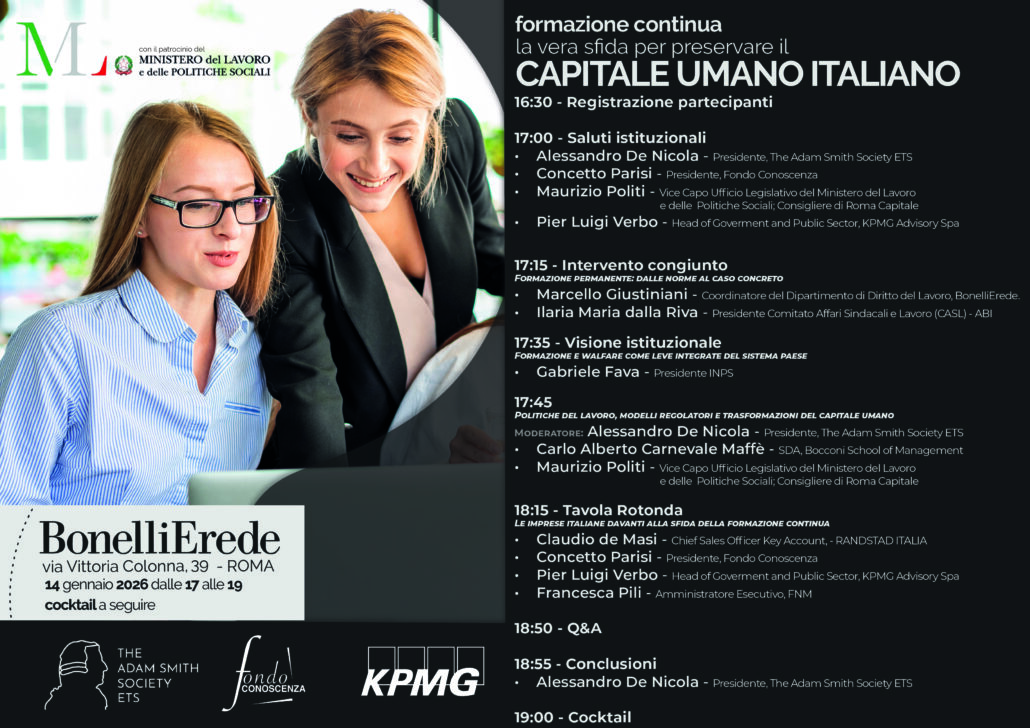 Formazione continua: la vera sfida per preservare il capitale umano italiano 14 gennaio 2026 Roma Studio BonelliErede Il convegno dedicato
